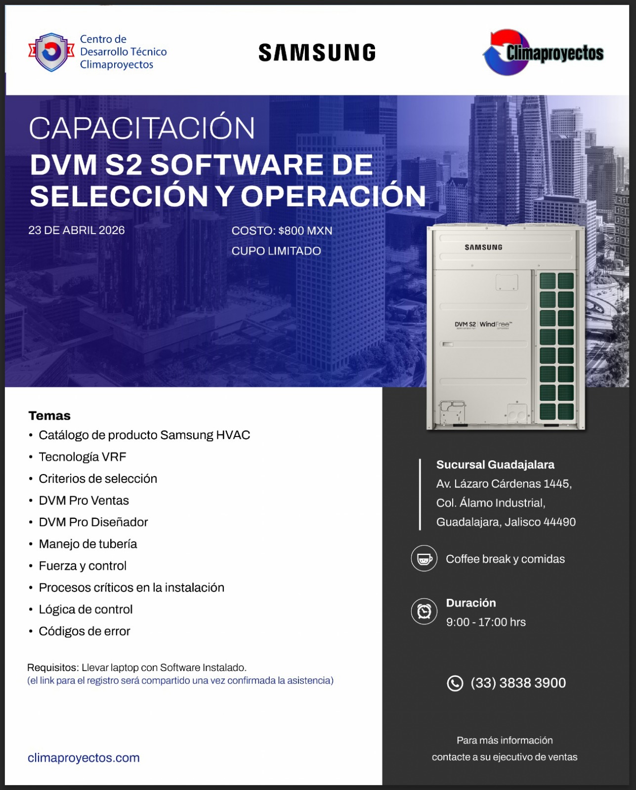 Requisitos: Llevar laptop con software instalado (El link de registro será compartido una vez confirmada la asistencia). Conocimientos básicos de aire acondicionado en instalación de sistemas