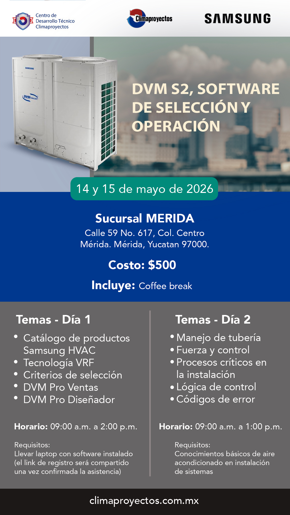 Requisitos: Llevar laptop con software instalado (El link de registro será compartido una vez confirmada la asistencia). Conocimientos básicos de aire acondicionado en instalación de sistemas